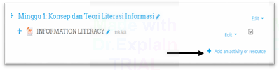 Setelah mode ubah dihidupkan, pada kolom topik silabus yang akan dicantumkan Forum Diskusi, klik Add an activity and resource pada sudut kanan bawah pada kotak topik silabus.