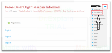 Jika sudah selesai semuanya, maka silabus telah selesai dibuat, silahkan kembali pada pengaturan sebelumnya. Klik icon setting pada pojok kanan atas kemudian klik Turn Editing Off.