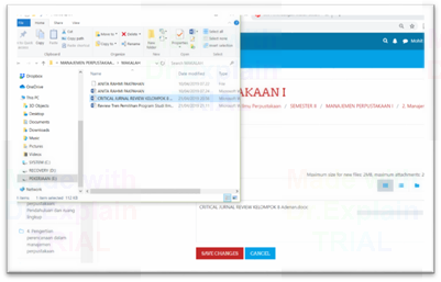 Pada jendela berikutnya yaitu halaman File submission, anda akan melihat kotak untuk memasukkan file. Ada du acara untuk memasukkan file yang akan dikirim. Cara pertama adalah dengan mengklik gambar file (kertas) di sudut kiri atas kotak hingga Windows Explorer terbuka. Cara kedua adalah dengan membuka Windows Explorer di komputer anda lalu geser file dan masukkan kedalam kotak di e-learning.
