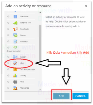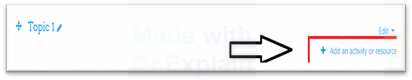 Kemudian, untuk menambahkan tes (ujian) pilhan berganda (multiple choice) klik Add an Activity or Resource pada topik atau materi perkuliahan yang diinginkan.