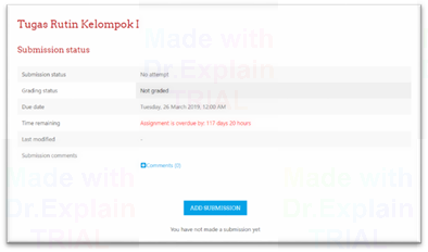 Pada jendela berikutnya, anda akan melihat Submission Status. Disini anda perlu perhatikan beberapa informasi yang dimuat, diantaranya Submission status (status penyerahan), Grading status (status nilai), Due Date (tanggal akhir penyerahan tugas), Time remaining (waktu yang tersisa), Submission comments (komentar penyerahan). Untuk mengirim atau mengunggah file tugas, klik tombol “add Submission” pada bagian bawah seperti contoh berikut: