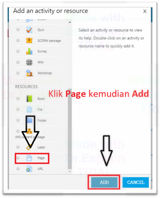 Setelah itu, akan muncul berbagai resource yang bisa ditambahkan sebagai bahan pembelajaran. Untuk menyematkan video yang telah dicopy, maka klik Page pada menu Resource. Selanjutnya klik Add.